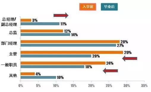 职业跳板,总经理/副总经理级别的学员占比从入学前的3%提升到毕业后的11%,说明通过就读MBA对个人职业发展起到了促进作用。