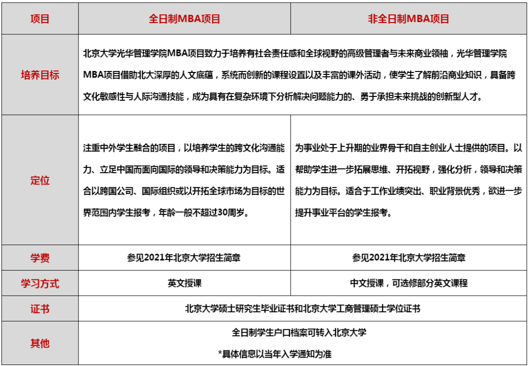 北京大学光华管理学院MBA2021年招生包含全日制MBA和非全日制MBA项目。